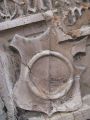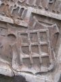 Schmalhochrechteckige Rotmarmorplatte mit schmalem Rahmen. Schmucklos bis auf die Wappen und das Steinmetzzeichen dazwischen.