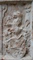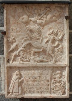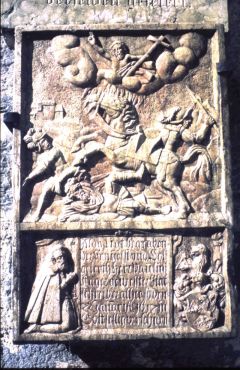 Starke, kleinformatige Rotmarmorplatte, von schmaler Leiste gerahmt, die auch das Bild- vom Schriftfeld trennt. Im oberen Teil Flachrelief mit der Darstellung des Sturzes von Saulus/Paulus vom Pferd vor Damaskus. In der Mitte das scheuende Pferd, darüber Christus mit Kreuz in den Wolken. Unter dem Pferd Saulus. Seitlich je ein bewaffneter Begleiter, der sich erschreckt abwendet. Im Hintergrund durch Gebäude die Stadt Damaskus angedeutet. Im unteren Drittel in der Mitte eine Schrifttafel. Rechts der Verstorbene kniend, links sein Wappen. Der Verstorbene betend in zeitgenössischer Tracht vor Vorhangdraperie kniend. Die Figur ähnelt den späteren Darstellungen von Gregor Pichler[2].