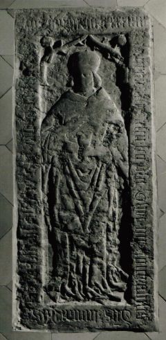 Der Grabstein wurde bei der Kirchenrenovierung 1979/80 bei der Herausnahme des Pflasters wohl in situ entdeckt. Eine Untersuchung der Grabstelle wurde damals durch Pfarrer Bauer untersagt. Der Grabstein für den Geistlichen ist stellenweise so sehr abgetreten bzw. die Oberflächenstruktur zerstört, dass die umlaufende Schrift nicht mehr voll lesbar ist. Der Geistliche, gekleidet in die priesterlichen Gewänder mit dem Birett auf dem Kopf, steht in einem vertieften Feld, das nach oben mit Rankenwerk in Kielbogenform abgeschlossen wird. In der linken Hand hält der Geistliche den Kelch, die rechte ist zum Segengestus erhoben.