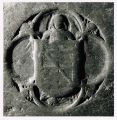 Verschlussplatte zur Estermanngruft – der Eingang lag im Bereich des Ganges, die Gruft selbst vermutlich unter der Kapelle Nr. 7. Die Gruft kann erst beim Bau der Chorumgangskapellen angelegt worden sein. Bis auf das Wappen in Vierpass völlig blank getreten. Ein Engel hält das Wappen, in den Zwickeln kleine Engelsköpfchen.
