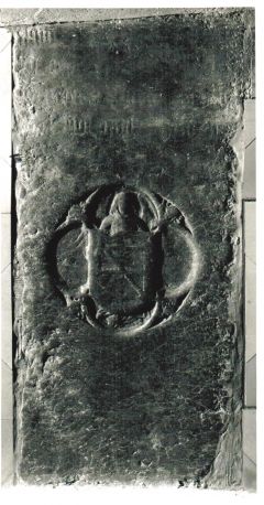Die Platte muss in einem häufig benützten Gang gelegen haben, da sie fast völlig abgetreten ist. Die Verwendung des Motivs eines wappenhaltenden Engels könnte auf Wolfgang Leb[3] hindeuten (vergleiche Grabdenkmal, Nr. 58, Widder, 1509; Dreipass mit Emblem vergleiche Pfarrkirche in Babensham)