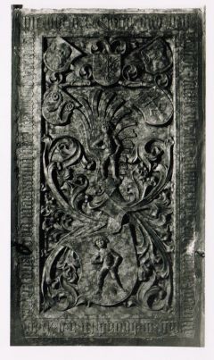 Das große Vollwappen der Familie wird im oberen Drittel des Bildfeldes von einem stilisierten Astwerkbogen gerahmt, der mit fünf Sippschaftswappen belegt ist. Umlaufende Inschrift auf dem Plattenrand, durch schmale Leiste vom Bildfeld getrennt. Liedke[4] schreibt dieses Epitaph dem Wolfgang Leb zu. Es müsste eine der letzten Arbeiten Lebs sein, für den die archivalischen Nachweise 1514 enden.