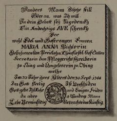 Anna Maria Pichler, * 1678, † 30.9.1748, gehört zu den sogenannten Amtsnutznießerinnen, wobei im 18. Jahrhundert Pfleggerichte und ihre untergeordneten Ämter auch an Frauen verliehen wurden. Teilweise waren es Witwen oder Töchter von Beamten, Hofdamen, Kammerjungfern oder Töchter von langjährigen Hofbediensteten, die auf diese Weise einen Unterhalt bekamen. In der Regel mussten sie aber ein zur Amtsführung taugliches Subjekt heiraten, denn mit der eigentlichen Amtsausübung durften sich die Frauen, außer bei ganz untergeordneten Aufgaben, nicht befassen. Daher ist davon auszugehen, dass sich ihr Gemahl unter den Beamten von Kling finden lässt: Wahrscheinlich handelt es sich um Johann Karl Pichler d. J., Hofkammersekretär zu Kling und (Ober-)Umgelter von Obing, † 15.2.1733. Johann Karl Pichler ist in Schnaitsee begraben worden, sein Epitaph befindet sich in der nördlichen hinteren Kapelle.[2] Warum Maria Anna Pichler nicht in Schnaitsee bestattet wurde, lässt sich vielleicht nur mit der Familiengrabstätte der Praitlohn in Wasserburg erklären.