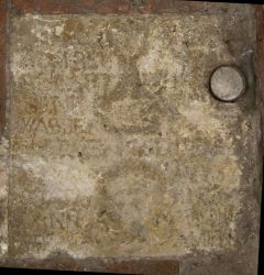 Quadratische Platte, oben in der Mitte kleines Relief mit Kelch und Totenschädel mit Birett.