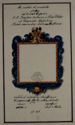 Die Platte war einst mit einem geschnitzten Rahmen aus Laubwerk gefasst, wobei oben in der Mitte das Wappen der Praidlon und unten ein Totenkopf mit gekreuztem Gebein angebracht war. Springer hat diesen Rahmen noch wiedergegeben, jedoch nicht die Inschrift, sondern nur das priesterliche Standessymbol (Kelch auf Buch) in einem Dreipass skizziert. Den Text gibt er handschriftlich über und unter der Skizze wieder. Er nennt als Todesdatum jedoch den 4. März, ebenso wie Lehner. Zu den Praidlon siehe auch Grabdenkmal, Nr. 5, Copaur, 1730 und Grabdenkmal, Nr. 6, Pichler, 1748. Zur Person: Joseph Anton von Praidlon ist am 3.1.1701 an der Universität Ingolstadt als Student beider Rechte im Matrikelbuch verzeichnet gegen eine Gebühr von 1 fl. (dort Braidtlohner geschrieben). Er muss also kurz nach Studienabschluss und Weihe gestorben sein, vermutlich beim Versuch, das Leben eines in Not geratenen Menschen zu retten. Reithofer[5] gibt an, Praidlohn habe sich bei seinen eifrigen Krankenbesuchen infiziert und sei an der ansteckenden Krankheit, die 1705/06 grassierte gestorben. Die Bezeichnung im Sterbebuch der Pfarrei als nobilis Praidtlohner kann sich auf sein Adelsprädikat beziehen oder auf die Textzeile christina doctrina nobilis. Lehner[6] bringt keinen Text.