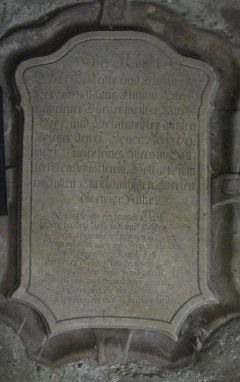 | Hier Ruhet Der Wohledle und Wohlweise Herr Wolfgang Antoni Steib gewesener Bürgermeister, Handels Herr und Schiffmeister allhier, Welcher den 6. Jener Ao1769 im 75.ten Jahre seines Alters in Gott seelig entschlaffen ist. Gott gebe ihm und allen Christgläubigen Seelen die ewige Ruhe. Er lebte als ein fromer Christ Dem täglich Jesu todt und Leiden Sein Augenmerckh gewesen ist, Drum muest er auch am Freytag scheiden. Am Heiligen drei Kenig Fest Verlies er dieses schnöde Leben, Er wollt dem Jesukind getrost Sein Leib als Seel Zum Opfer geben. O Leser, nim dir dies Zu Sinn, Sei auch ein Christ und beth für ihn. |