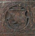 Wappen der Fröschl in Kreis mit Renaissance-Ornamentik. Eigentlich würde man ein Allianzwappen erwarten, das auch der Familie Langenmantel Rechnung trägt.
