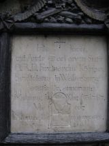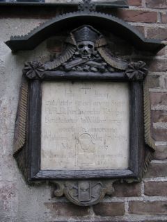 Quadratische Kelheimer Platte in Eichenholzrahmen mit Draperie, oben Totenkopf mit Birett auf gekreuztem Gebein, unten Stundenglas, Sense und Schaufel. Reste der Fassung in rot, gold und schwarz erhalten. In der Platte Kelch als Standessymbol.
