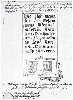 | Hie ligt we[gra] bn der Ersa[m] weys Mich[ael] marte[in Barb] ar[a sein hausfr] [aw Ist gestorbn] [an sand Kun] [rats tag …] [herlist an m. cccc.] |
