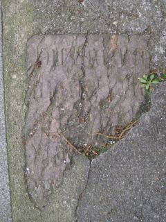 Oberes linkes Eck einer schmalen, hochrechteckigen Grabplatte mit abschließenden Wappen der Verstorbenen.