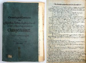 Eine ausführliche handschriftliche Genealogie & Geschichte der zu Wasserburg, Trostberg, Augsburg, Linz und zuletzt in Regensburg angesessenen Gumpelzhaimer liegt weitgehend unbeachtet im Stadtarchiv vor.[4] Zwar hat Richard Charteris auch hieraus jüngst neue Erkenntnisse zum Musiker Adam Gumpelzhaimer, dem wohl bekanntesten Vertreter der Trostberger Linie, ableiten können.[5] Neben dieser speziellen musikwissenschaftlichen Studie fehlen jedoch moderne Auswertungen zur Familiengeschichte.