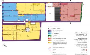 1974 Heranziehung des nordwestlichen Raumes 00.06 im Erdgeschoss des Vorderhauses, der zuvor nicht als Ausstellungsraum verwendet worden war, für das Museum, Zusetzung der Türöffnung in dessen Nordwand.