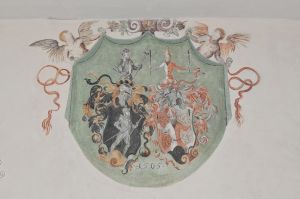 4. Allianzwappen Altershamer / Kulbinger vor Vorhang, von Engeln gehalten, darunter die Jahreszahl 1505. Links Wappen Altershamer, ein Geharnischter mit Streithammer vor schwarzem Grund, rechts Wappen Kulbinger, ein Narr in Rot und Weiß vor Grund in Rot und Weiß.