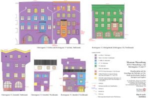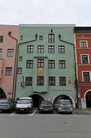 - An der Südfassade die Abnahme des gesamten Altputzes, die Rekonstruktion der Ladeöffnung und der zwei Fenster im Dachgeschoss, die Rekonstruktion des Erkers und eine leichte Erhöhung der Vorschussmauer; die Neufassung der Fassade nach Befund einer nachmittelalterlichen, wohl barocken Fassung in hellem Grün mit weißen Fensterrahmungen. Weiterhin die Restaurierung des Juristenfreskos, die Öffnung der segmentbogigen Wandnische am Westende der Fassade und die Neuherstellung des Wappenbildes der Familie Fröhlich in der Nische, mit den Initialen A.[chaz] F.[röhlich], nach Befund. [43] Schließlich die Anbringung einer Malerei mit dem Wasserburger Löwen zwischen einer Darstellung der beiden Rotmarmorsäulen im Inneren des Zwischengeschosses am Erker zwischen Zwischengeschoss und ersten Obergeschoss.