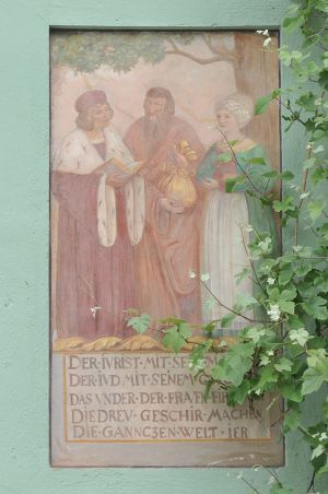 Nach Steffan wurde das Wappen der Altershamer nach 1567 mit dem Wappen der Donnersberg übermalt, als Thomas Altershamer Elisabeth Donnersberg heiratete. Die Übermalung wurde 1981 zusammen mit einer Renaissance-Umrahmung mit seitlichen Säulen und ornamentalem Abschluß der Basisleiste abgenommen bzw. überfasst.[26] Die Übermalung erscheint jedoch erst unter einem männlichen Hausbesitzer aus der Familie Donnersberg, wohl nach dem Tode des Thomas Altershamer 1614 sinnvoll, da ansonsten nur die Wappen von eingeheirateten Ehefrauen aus den Familien Kulbinger und Donnersberg nebeneinander sichtbar gewesen wären.