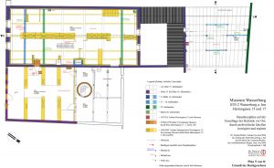 - Im ersten Obergeschoss die teilweise Erneuerung und Ergänzung des Fachwerks der Innenwände, die Neuausfachung mit Leichtbauziegeln und die Herstellung des Durchgangs zum Haus Herrengasse 15. Hier befand sich zuvor in der Reihe eine Treppe vom Zwischengeschoss zum ersten Obergeschoss. Angeblich Belassung des Aufbaus der Fußböden und der Fenster in den Innenwänden. Abbruch der Treppe und des Lichtschachtes an der westlichen Außenwand, in der Nordwestecke von Raum 01.16. Wohl Freilegung der Balken-Bohlendecken in den südlichen Räumen 01.15 und 01.21 und im nordöstlichen Raum 01.19.
