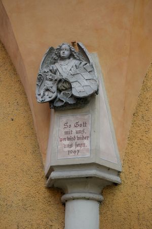 Das Haus ist viergeschossig mit Vorschussmauer. An der Südostecke ist ein polygonaler Eckerker angebracht, der sich oberhalb einer Halbsäule erhebt. Die Säule mit stilisierter Wolke (Wolkenband), darüber die Büste eines geflügelten Engels, der zwei Schilde in Tartschenform mit den Wappen Wasserburgs oder der Pfalz (Löwe)[8] und Bayerns (Rautenschild) in Relief vor sich hält. Darunter befindet sich der erneuerte Wahlspruch So Gott mit uns, wer wird wider uns seyn. 1497. Die Jahreszahl lautete 1902 noch 1097, wurde als verschrieben interpretiert und deshalb später in 1497 abgeändert. Die qualitätvolle Skulptur schrieb man 1902 noch dem Bildhauer Wolfgang Leb zu.[9] Von Liedke wird sie unter den Werken Lebs allerdings nicht mehr aufgeführt.[10]