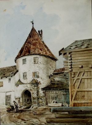 Der schon vor dem Anbau der Salzstädel an der Ringmauer und den auf der anderen Seite stehenden Hüt[t]en erbaute Thurm verbindet die Stadt mit dem Gries und mit dem daselbst stehenden freyen Salz- und dem städtischen Baustadl durch das unter demselben angebrachte Thor. Der Thurm diente immer zur Dienstwohnung für den Bauschreiber, bis diese Communal-Bedienstung sich auflöste, wornach der Thurm am 30. Oktober 1807 an Joseph Bachzahner Maurer verkauft wurde; jetzt befindet sich derselbe in dem Eigenthume seines Sohnes Joseph Bachzahner ebenfalls Maurer. Der Thurm ist mit einem Spitzdache von Ziegelblatten versehen, und hat zuverläßig noch seine ursprüngliche Bauform. In dem Thorbogen befindet sich ein an die Wand gemahltes Kruzifix mit dem Namensschrifter A. H. A. A. E. H. A und der Jahrzahl 17- vermuthlich 1716. Nicht ungern haben die Alten unter den Thoren heilige Bilder angebracht, wahrscheinlich nebst der Beförderung des christlichen Sinnes die Verunreinigung dergleichen Räumlichkeiten dadurch besser zu verhindern.[2]