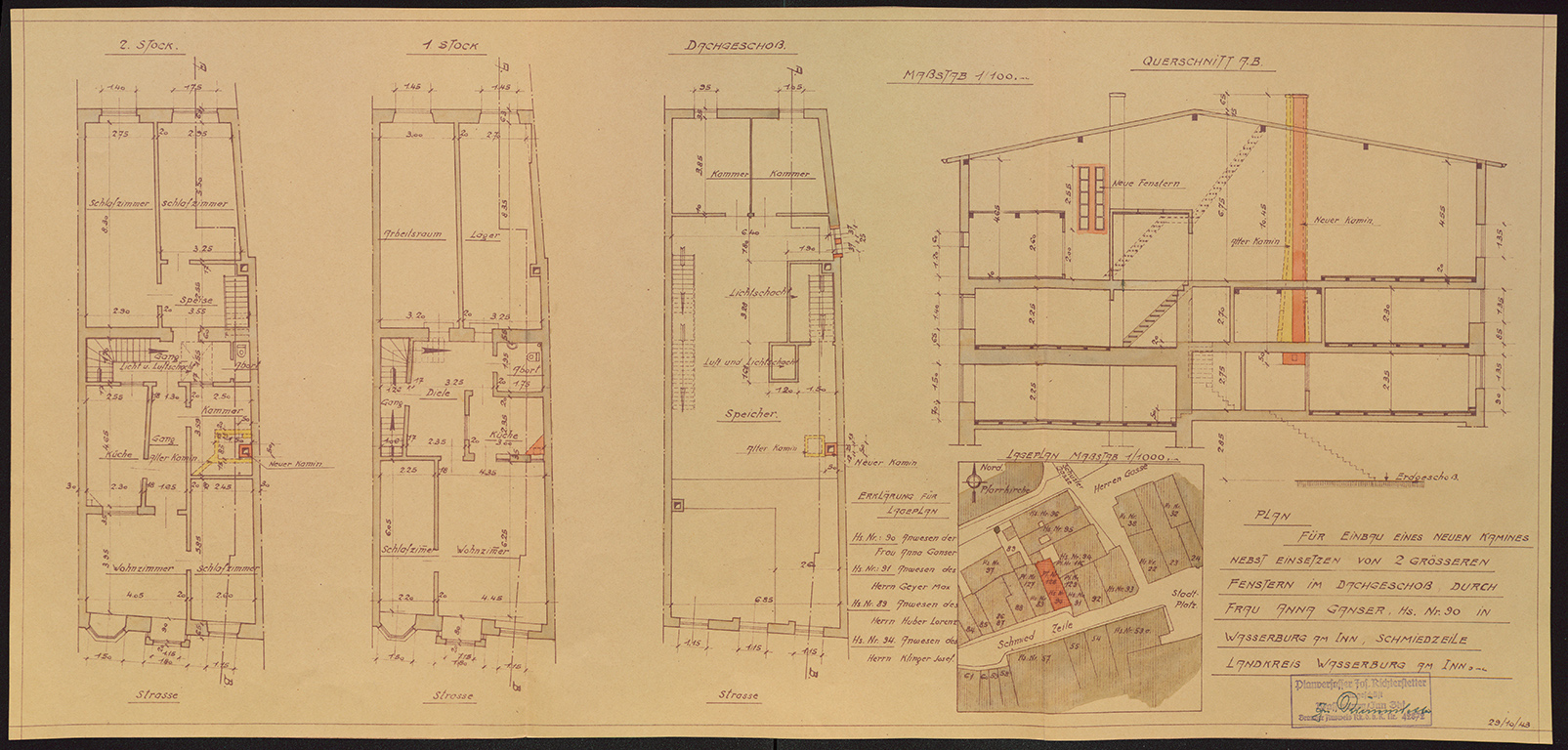 | 12:17, 25. Mär. 2020 | Ganserhaus bauplan 1943 stadta wasserburg II 2372 0012 klein.jpg (Datei) | 660 KB | Ganserhaus, Bauplan von 1943, Lageplan, Schnitt und Grundrisse der drei Obergeschosse. StadtA Wasserburg a. Inn, II2372 | 1 | |
