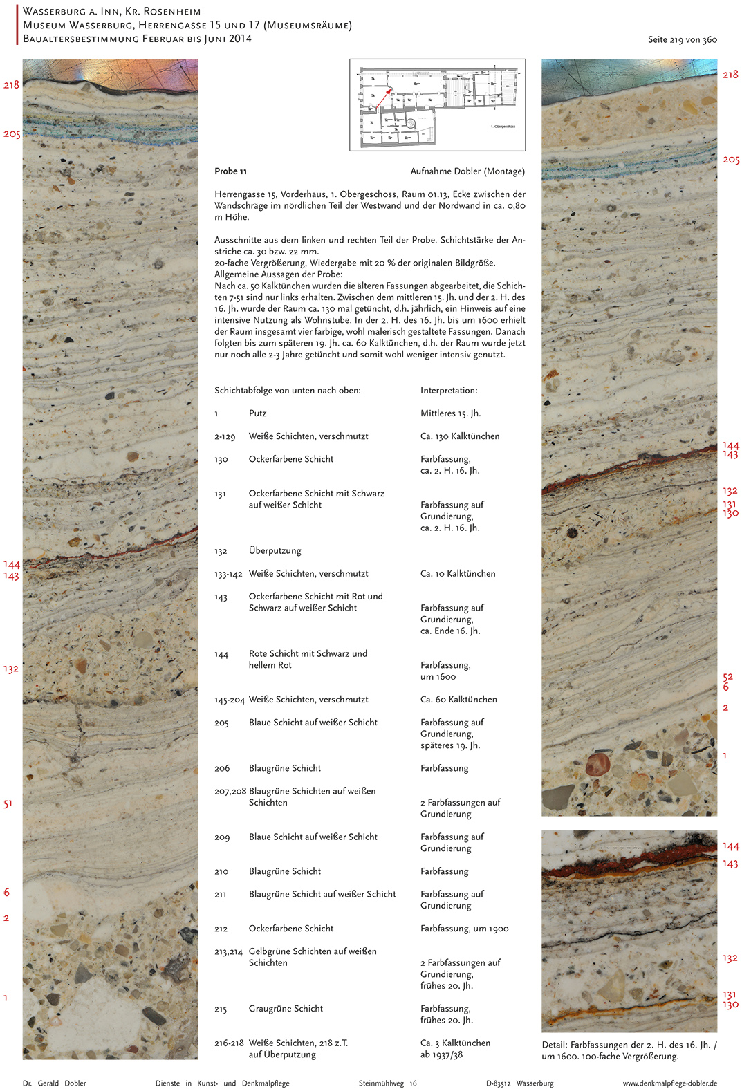 | 11:12, 29. Mär. 2020 | Probe 11 wasserburg museum baualtersbestimmung 140716 s 219.jpg (Datei) | 811 KB | Herrengasse 15, Wohnstube im 1. Obergeschoss, Querschliffe durch die ca. 220 Wandanstriche seit der Mitte des 15. Jahrhunderts. Dobler, Herrengasse 15, 17, 219. | 1 | |
