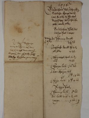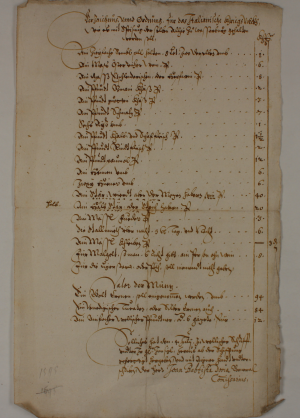 Höchstwahrscheinlich entstand in diesem Zusammenhang auch die Haubt Rechnung und Summarische Beschreibung aller Ausgaben und Uncosten eines Durchzugs italienischer Truppen, die in päpstlichen Diensten standen, und kaiserlicher Truppen unter dem Herzog von Mantua, die mit 300 Pferden und 22 Fähnlein[43] Fußvolk zehn Nächte in Wasserburg lagen.[44] Es werden auf mehreren Seiten, die zu einem kleinen Heft in Halbfolio-Format zusammengebunden sind, alle entstandenen Ausgaben und Unkosten aufgeführt. Die Gesamtsumme, die am Ende gebildet wird, beträgt 149 Gulden 30 ¾ x. Unterschrieben ist die Abrechnung von den beiden Stadtkämmerern Abraham Khern und Anndre Planckh.