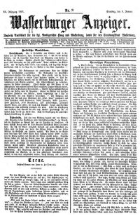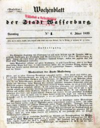 Nachdem die Königliche Regierung von Oberbayern dem seit 1826 in Wasserburg ansässigen Verleger Adam Kling am 20. Dezember 1839 die gnädigste Bewilligung zur Herausgabe eines Wochenblattes in der Stadt Wasserburg ertheilt hatte, erschien die Nummer 1 des ‚Wasserburger Anzeigers‘ unter dem Titel ‚Wochenblatt der Stadt Wasserburg‘ am Sonntag, dem 6. Januar 1839.[1] Erster Redakteur war der seit 1836 in Wasserburg ansässige Tierarzt Dr. Johann Martin Kreutzer. Gedruckt wurde das nur einmal wöchentlich erscheinende Vier-Seiten-Blatt in der Auer Vorstadt von München.