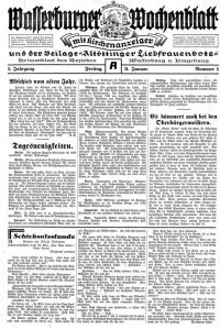 Vielleicht war dies nötig, weil sich der ‚Wasserburger Anzeiger‘ schon seit einiger Zeit mit einem lokalen Konkurrenten konfrontiert sah, der ganz dezidiert auf das Bekenntnis zur Katholischen Kirche und zur BVP setzte.[13] Das ‚Wasserburger Wochenblatt‘ hatte schon am 3. Januar 1930 die lokale Bühne betreten. Wie der ‚Wasserburger Anzeiger‘ fast ein Jahrhundert zuvor hatte auch die neue Zeitung, die von einer ‚Verlagsbuchdruckerei Wasserburg‘ gedruckt und von Franz Josef Zech als Redakteur betreut wurde, zunächst mit nur einer Ausgabe pro Woche begonnen. Ihre Haltung war eindeutig. Schon im Kopf hieß es unübersehbar mit Kirchenanzeiger und der Beilage ‚Altöttinger Liebfrauenbote‘. Verkauft wurde die Ausgabe A mit dem ‚Altöttinger Kirchenboten‘ für 2,70 Mark im Vierteljahr, die Ausgabe B ohne die Beilage für 1,80 Mark.