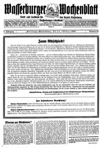 unserer heimischen Parteipresse, unserem ‚Wasserburger Anzeiger‘, der so viel für unsere Parteisache in den letzten Wochen getan und uns großartig in der Parteiarbeit unterstützt hat. Wir glauben, diesen Dank nicht besser zum Ausdruck bringen zu können, als daß wir unsere Parteifreunde in Stadt und Land hiermit auffordern, unser Heimatblatt, den ‚Wasserburger Anzeiger‘, durch vermehrtes Abonnement und Druckaufträge zu unterstützen.