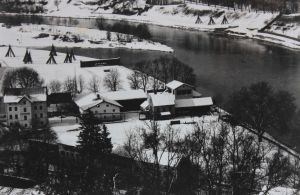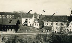 In der Folge ging das Gebäude an die Stadt Wasserburg über, welches ab 1933 zunächst durch NSDAP, NSV, Hitlerjugend und NS-Frauenschaft genutzt wurde. Nach intensiven Bemühungen der Stadt konnte diese ab 1939 einen neuen Mieter für das für eine gewerbliche Nutzung geeignete Mietobjekt finden. Der politische Wunsch der Gewerbeansiedlung gelang ab 1939 mit dem Einzug der Stuttgarter Knagge und Peitz Kleiderfabrik. Während der Kriegszeiten wurden hier hauptsächlich Uniformen gefertigt. Durchschnittlich 14% der Mitarbeiter in der Zeit 1939-1945 waren Zwangsarbeiterinnen.[156] Das für den Betrieb benötigte Wasser wurde der Kleiderfabrik bis zum Verbrauch von 500 Kubikmeter Wasser (500.000 Liter) kostenfrei durch die Stadt zur Verfügung gestellt. Die Lage am Bach scheint für Knagge und Peitz nicht mehr wichtig gewesen zu sein. Im Gegenteil, sie wurde zur Last: Die Uferschutzmauern des Wuhrbachs waren in den 1940er Jahren in einem schlechten Zustand, das Mauerwerk des Gebäudes soll bis zum 1. Stockwerk hinauf feucht, die Räume klamm gewesen sein. Im Jahr 1940 wurde daher erstmals eine Warmwasserheizung in das Gebäude eingebaut. In den Wuhrbach eingeleitet wurde zwar noch das Abwasser, als problematisch wurde jedoch ausschließlich die Einleitung des Abwassers der Abortanlagen gesehen: Da der Bach häufig nur ganz geringe Wassermengen führte, blieben die Fäkalien nebst Papierteilen liegen und verbreiteten einen unangenehmen Geruch.[157] Übrigens waren viele der am Wuhr- oder Fehlbach liegenden Gebäude - darunter auch die der ehemaligen Wildgrubermühle nachfolgende Brennerei Sigl - gemäß einer Aktennotiz im Gebäudeakt Knagge und Peitz noch bis in die 1960er Jahre hinein nicht an die Kanalisation angeschlossen und leiteten ihre Abwässer, unter anderem aus Abort- und Klärgruben, direkt in den Bach ein.[158]