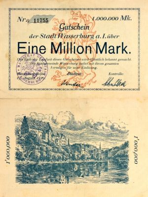Staat und Wirtschaft hatten darüber hinaus mit einer massiven Geldentwertung zu kämpfen, die mit Kriegsausbruch 1914 begonnen und sich gegen Ende des Jahres 1923 zu einer Hyperinflation entwickelt hatte. Immer mehr Papiergeld kam in Umlauf, die Preise erreichten astronomische Höhen. Im Herbst 1923 reichte in Wasserburg, wie in anderen Städten auch, die Menge an staatlich ausgegebenem Papiergeld nicht mehr aus, um den steigenden Geldbeträgen Herr zu werden. Daher beschloss der Stadtrat am 29. August 1923 die Ausgabe von sogenanntem Notgeld in Gesamthöhe von 20 Milliarden Mark. Ausgegeben werden sollten Scheine im Nennwert von 500.000 beziehungsweise 1 Million Mark. Als Ausgabetermin wurde der 1. September anvisiert.[2] Doch die Inflation zog weiter an. Am 9. Oktober 1923 lag der Umtauschkurs zum US-Dollar laut Wasserburger Anzeiger bei über 1,2 Milliarden Mark, während eine Schachtel Streichhölzer mit mindestens 4 Millionen Mark zu Buche schlug.[3] Zehn Tage später, am 19. Oktober, kostete ein US-Dollar 5,5 Milliarden und ein Wasserburger musste für eine Semmel vierzehn Millionen und für ein Pfund Schwarzbrot 140 Millionen Mark zahlen.[4] Ein Ferngespräch kostete bald 500 Millionen, da war das Ortsgespräch für 50 Millionen Mark vergleichsweise günstig.[5]