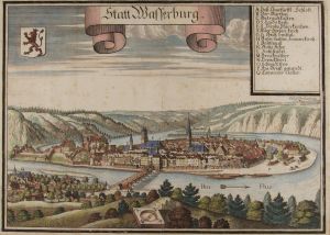1927 benannt. Umbenennung aus Uferweg.[1] Ehrt die Bildhauergebrüder David, Martin und Michael Zi(e)rn (bekannter ist die Schreibweise Zürn). Die wohl ursprünglich für das Burgerfeld vorgesehene Wegbezeichnung griff den Vorschlag – an dieser Stelle leider mehr als unglücklich – wieder auf und würdigt die Bildhauerfamilie insgesamt durch den isoliert stehenden Familiennamen. Die Stein- und Holzbildhauer Martin und Michael Zürn haben 1638 die berühmte Kanzel in der Stadtpfarrkirche St. Jakob geschaffen (umfangreich erforscht, daher an dieser Stelle nicht zu wiederholen). Die historisch überlieferte Bezeichnung für diesen Bereich des Innufers zwischen Brucktor und ehemaligem Tränktor, die eng mit der Geschichte der Innschifffahrt Wasserburgs verbunden werden kann, ist jedoch die nutzungsbezogene Namenbezeichnung als Floßlände oder Schifflände. Bereits am 16.0.1354 wird diese urkundlich erwähnt. Die letzte magistratische Ländordnung aus dem Jahr 1832 verdeutlicht die lange Tradition der Wasserburger Schifflände als eines der wichtigsten Instrumente einer Handelsstadt am Fluss. Vor dem Tränktor, an dem der Inn unmittelbar vorüber floss, wie es der Grundriss aus dem Jahr 1615 verdeutlicht, landeten die Schiffe mit ihren Waren. Die Lände wird in diesem Jahrhundert durch den Mautner Wolfgang Pistorius in einem Schreiben vom 5.11.1657 an den Rat der Stadt beschrieben als die bequemste Landstatt, allda alle potentaten und cavaliri von der schiffung aus und wieder einzutreten pflegen. Dass man sich im Zusammenhang dieser Darstellung nicht ausführlich mit der Geschichte der Innschifffahrt Wasserburgs und somit der ehemaligen Schifflände am heutigen Zirnweg im Übergang zum Otto-Geigenberger-Weg beschäftigen kann, ist klar. Einige Rückblicke in das 16. Jahrhundert der Innschifffahrt sollen aber beispielhaft einen kurzen Eindruck vermitteln: Wasserburg war zu dieser Zeit für den Getreidehandel auf dem Wasserweg des Inn von größter Bedeutung, u.a. für den Geschäftsverkehr zwischen Bayern und Tirol, als einer der wichtigsten bayerischen Stapelplätze und als Innhafen Münchens. Nach den Wasserburger Kastenamtsrechnungen konnte beispielsweise ein vierspänniger Bauernwagen von der Lände Wasserburg bis zum Hofkasten München im 16. Jahrhundert sechs Scheffel Hafer befördern. Zur Abfuhr eines vollen, mit Getreide beladenen Schiffzuges, waren damit über 400 Scharwerksfuhren oder fast 1700 Pferde erforderlich – ein immenses Treiben vor den Toren der Stadt muss das gewesen sein. Als Herzog Wilhelm IV. (1503-1550) 1546 auf der Burg den großen Kasten baute, hat unter Oberaufsicht von 2 Hofkellermeistern der Hof von 1529 bis 1546 fast ein Dutzend mal ain scheffart wein von Wasserburg aus gen München füren lassen. Der Wein war aus Tirol zu Schiff nach Wasserburg gekommen. Die günstige Lage Wasserburgs als Schifflände für nach München bestimmte Güter wird 1586 beim Bau des Jesuitenkollegs mit der St. Michaels-Kirche in München sowie der Residenz vor dem 30jährigen Krieg deutlich: Hier wurden zur Beförderung großer Marmorblöcke mit Vorliebe die Fuhrwerke der Klöster Altenhohenau und Rott sowie Attel, Gars und Au aufgeboten. Nach der Hofzahlamtsrechnung von 1586 ist für die Klosterfuhren von Attel, Rott, Baumburg und Beyharting in München Stallmiete bezahlt worden.[2]