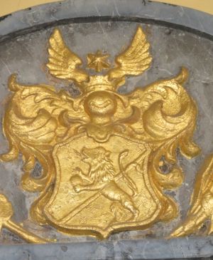 Schild schräg links geteilt, oben rot, unten weiß/silbern –darin schreitender Löwe nach rechts in wechselnden Farben, der einen sechszackigen Stern in den Pranken hält. Helm mit Adlerflug in wechselnden Farben, dazwischen Stern. Am Epitaph hält der Löwe eine Kugel in den Pranken, den Helm ziert aber der Stern.