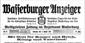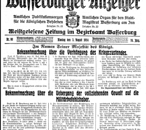 Auch in Wasserburg dürfte die Kriegsbegeisterung im Sommer 1914 groß gewesen sein. Und es darf die These gewagt werden, dass auch hier die militärische Option gegenüber der politischen die Oberhand behielt. Allerdings wurden die Ereignisse ab dem 23. Juli 1914, dem Tag, an dem der französische Staatspräsident Poincaré St. Petersburg verließ und die Österreichisch-Ungarische Regierung der Serbischen ihr Ultimatum vorlegte, weder in der Ausgabe des Wasserburger Anzeigers vom 25. Juli 1914 noch in der vom 28. Juli 1914 erwähnt. Dies geschah erst am 30. Juli 1914. Viele andere Zeitungen berichteten hingegen bereits ab 24. Juli 1914 über diese Note, deren Ton als harsch und undiplomatisch interpretiert wurde[10].