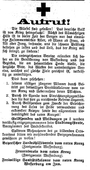 Im Übrigen war kein direktes Kriegsgeschehen in Wasserburg spürbar, der Krieg begann in Belgien, wo die deutschen Truppen, dem Schlieffen-Plan folgend, Belgien überrannten, Luxemburg[14] besetzten und in Richtung Frankreich und Ostpreußen (Tannenbergschlacht) marschierten. Insofern spürte man in Wasserburg die Auswirkungen des Krieges zwar sehr deutlich, auch wenn es hier kein Kriegsgeschehen im engeren Sinne gab.