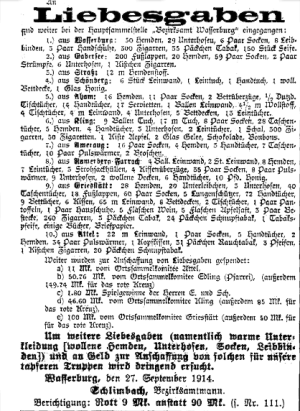 Liebesgaben 1914 - Bericht des Wasserburger Anzeigers über eingegangene Spenden